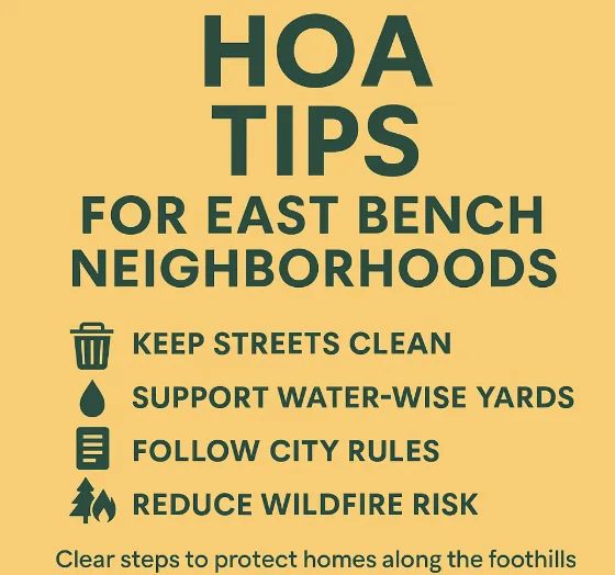 HOA Tips for East Bench Neighborhoods The East Bench sits along the Wasatch foothills. That means sun, slope, wind, and