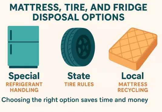 Mattress, Tire, and Fridge Disposal Options Some things like refrigerators need special handling because of refrigerant. Tires follow state rules